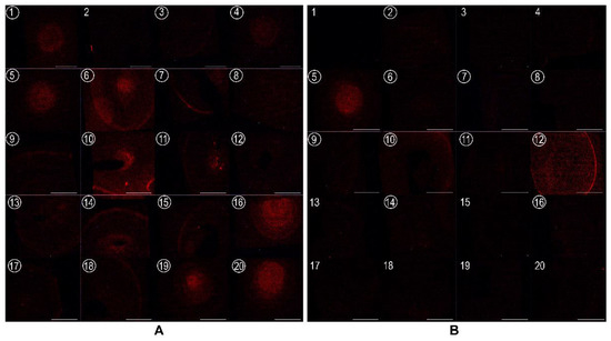 Dot blot images of EryA-mCherry binding to total lipid extracts from clinical supragingival plaque samples from patients and healthy individuals. Twenty samples (A) from patients with periodontal disease and twenty (B) from healthy individuals (200 µg lipids) were applied on a nitrocellulose membrane, incubated with EryA-mCherry (2 µg/mL) and the intensity of fluorescence was measured. Scale bar: 5 mm. Positive samples are indicated by a number within the circle.