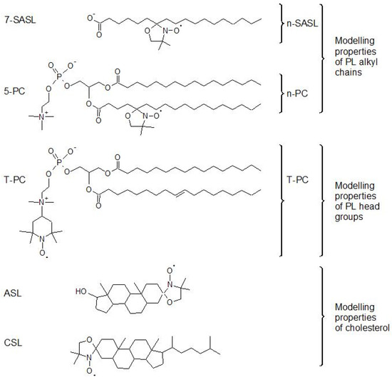 The major nitroxide, free radical, lipid spin labels, which were later used in membrane studies, were first synthetized between 1967 and 1971. Primarily, three classes of these spin labels were used: spin-labeled stearic acids with the nitroxide fragment attached to different carbon atoms of the acyl chain (n-SASLs, synthesis described in [1,2,3]); spin-labeled phosphatidylcholines with the nitroxide fragment attached at selected positions on the fatty acid chain (n-PCs, synthesis described in [1]); or the polar head group (T-PC, synthesis described in [4]), and spin-labeled cholesterol (Chol) analogs (ASL, synthesis described in [5], and CSL, synthesis described in [6]) (see Figure 1 for their structures). The nitroxide free radicals, first synthetized by Hoffman (1961) [7] and by Rozantsev and Neiman (1964) [8] and used as monitoring groups in lipid spin labels, are extremely stable in model membranes. In addition, the basic approaches to analyze the electron paramagnetic resonance (EPR) spectra of these spin labels are rather simple, and the same for all of the spin labels [9,10,11]. The lipid spin labels are easily introduced to model membranes, while the lipids are mixed for the preparation of multilamellar liposomes. All of these broadly expanded the applications of EPR spin labeling for membrane studies.