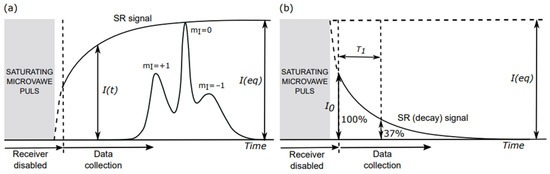 For spin-labeled multilamellar liposomes, the SR EPR signals at the X-band (microwave frequency 9.4 GHz) are received on the central line (mI = 0; see Figure 2a) of the EPR spin-label spectrum. To obtain the correct T1 values, the samples must be thoroughly deoxygenated (see Section 3). In this approach, which is used to obtain T1 values for single- and multi-exponential SR signals, it is not necessary for the pump pulse to be a saturating pulse. This qualitative SR EPR approach allows discrimination of the membrane domains. The SR EPR spin-labeling approach can also provide quantitative information about the lipids in the membrane domains (giving data about the relative amounts of PLs and Chol in the discriminated domains). The necessary condition for the quantitative approach is that the pump pulse completely saturates all of the components of the SR signal (see [39] for details of this method).
