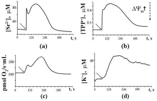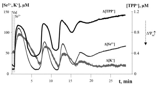 Figure 1 shows that a single addition of Sr2+ (45 nmol/mg protein) to rat liver mitochondria energized by succinate and incubated in hypotonic medium triggered short-term synchronous oscillations (two oscillating waves) of fluxes of Sr2+, K+, and TPP+ ions across the mitochondrial membrane, as well as reversible changes in the rate of O2 consumption. As one can see, the mitochondrial membrane potential (ΔΨm) estimated by the distribution of the molecular sensor TPP+ and the mitochondrial respiration rate recovered rapidly, and the added Sr2+ was eventually accumulated by the mitochondria. At the same time, the influx of K+ ions into the mitochondria was significantly slowed down. Under the resting-state conditions, the rate of transport of K+ across the mitochondrial membrane is known to be much lower than that of Ca2+ or Sr2+ [36,37]. One can suppose that the low rate of potassium transport limits the propagation of oscillating waves and is the main reason for the rapid damping of the Sr2+-induced spontaneous oscillations in ion fluxes and ΔΨm.
