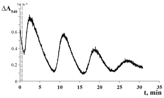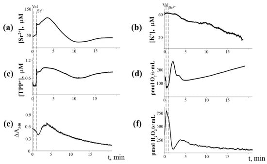 As seen from Figure 2, the co-addition of the potassium ionophore valinomycin to the mitochondrial suspension increased the number of spontaneous Sr2+-induced oscillation waves of the fluxes of Sr2+ and K+ ions, as well as ΔΨm. The long-term (within 30 min) reversible oscillations in ion fluxes and ΔΨm were induced by the addition of Sr2+ ions at concentrations of 35–50 nmol/mg protein and small amounts of valinomycin (2 ng/mg protein); in this case, three to five “cycles” of spontaneous ion oscillations in mitochondria could be observed (Figure 2).