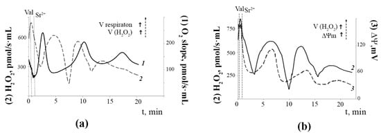 Sr2+/valinomycin-induced dynamic changes in the respiration rate (trace 1), H2O2 production rate (trace 2), and the membrane potential (trace 3) of rat liver mitochondria: (a) Reciprocal changes in the rates of oxygen consumption and H2O2 production by rat liver mitochondria after the addition of Sr2+ and valinomycin. The conditions were the same as in Figure 2. The rate of mitochondrial respiration (O2 slope, (pmol/s·ml)) was measured polarographically using an Oxygraph-2k respirometer and DatLab software (Oroboros Instruments, Innsbruck, Austria). The rate of H2O2 production (H2O2, (pmol/s·ml)) by the mitochondria was determined by the Amplex Red/peroxidase assay. The typical traces are presented (n = 5); (b) Synchronous changes in the rate of H2O2 production and the membrane potential of rat liver mitochondria after the addition of Sr2+ ions and valinomycin. The conditions were the same as in Figure 2. The mitochondrial membrane potential was estimated with the use of tetraphenylphosphonium (TPP+) and an electrode selective for TPP+ as described in the Materials and Methods section. The amount of TPP+ accumulated in mitochondria was determined by measuring the difference between its initial concentration and the concentration after the addition of mitochondria. The typical traces are presented (n = 5).