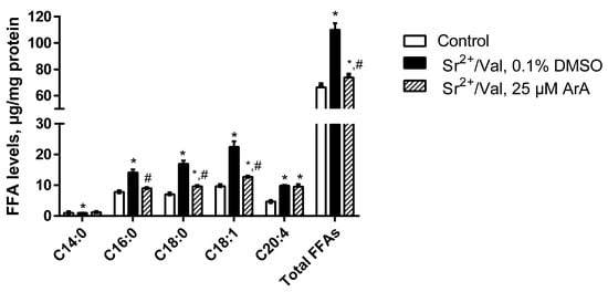 A comparative analysis of the content of the main free fatty acids in rat liver mitochondria before (control) and after the onset of Sr2+/valinomycin (Val)-induced ion oscillations in the absence (0.1% DMSO) or presence of 25 μM aristolochic acid (ArA), a phospholipase A2 (PLA2) inhibitor. The medium and conditions were the same as in Figure 2. The inhibitor of PLA2 ArA or 0.1% DMSO was added to a mitochondrial suspension 1 min before the addition of Sr2+. Data represent the means ± SEM of at least four independent experiments. * p < 0.05 vs. the control group (without additions); # p < 0.05 vs. the experimental group without PLA2 inhibitor (0.1% DMSO).