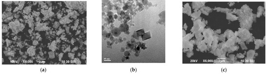Morphology of the initial electrolyte powders used for the suspension preparation: (a) SDC-gn (Tcalc = 900 °C) (SEM image); (b) SDC-lec (TEM image); (c) BCS-CuO (Tcalc = 1150 °C) (SEM image).