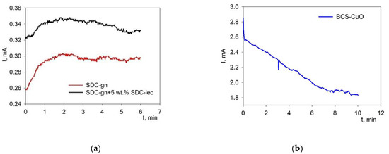 Change in the current strength with time during EPD on the Ni-foil model electrode: (a) for the suspensions of 10 g/L SDC-gn/lec and 10 g/L SDC-gn (V = 60 V, t = 6 min); (b) for the suspension of 10 g/L BCS-CuO (V = 80 V, t = 10 min).