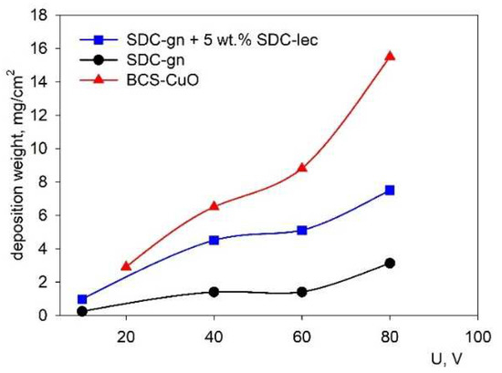 The dependences of the current strength on voltage (current–voltage characteristic (CVC)) obtained for all the suspensions of SDC-gn/lec, SDC-gn and BCS-CuO had a linear character with a change in voltage, which indicates the absence of a dependence of the particle mobility on the magnitude of the electric field strength. The dependences of the deposition weight on voltage (from 10 V to 80 V) measured at a fixed deposition time of 1 min are shown in Figure 3. The dependences obtained were characterized by a non-linear weight increase with increasing voltage. The EPD of the coatings from the composite SDC-gn/lec suspension was accompanied by a large increase in the deposited weight compared to the base SDC-gn suspension. The weight of the deposited coatings during EPD from the BCS-CuO suspension was significantly higher compared to that of the films formed in the SDC-gn suspensions, which is consistent with the above discussed measurement results on the current kinetics versus time (Figure 2).