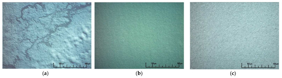 When using the SDC-gn base suspension, the formation of a continuous coating did not occur (Figure 4a), while the modification of the base suspension with the addition of 5 wt% SDC-lec nanopowder allowed the formation of a continuous, crack-free coating (Figure 4b). The EPD process with iodine-modified BCS-CuO suspensions makes it possible to obtain a continuous coating without cracks (Figure 4c). As we noted above, without the addition of iodine the EPD process did not occur (Section 3.1).