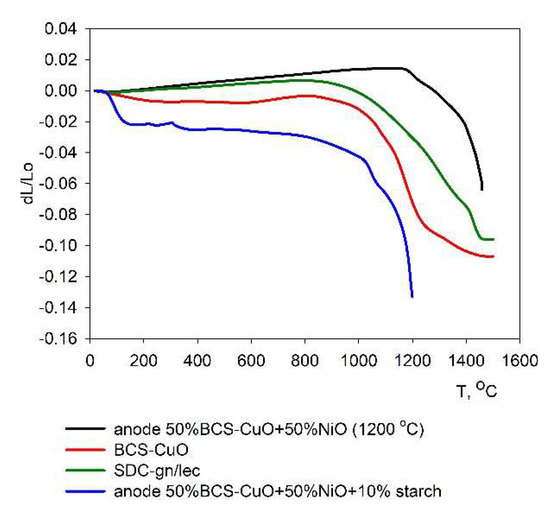 Dilatometric shrinkage curves of the SDC-gn/lec and BCS-CuO electrolyte materials, the 50 wt% NiO + 50 wt% BCS-CuO + 10 wt% starch anode material and the 50 wt% NiO + 50 wt% BCS-CuO anode material, pre-sintered at 1200 °C.