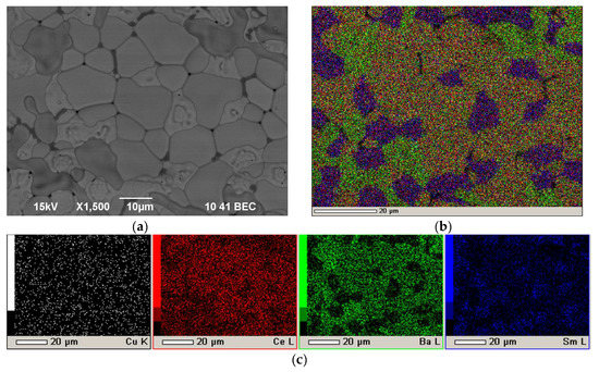 Surface of the BCS-CuO/SDC electrolyte layer after sintering at a temperature of 1450 °C for 5 h on the NiO-BCS-CuO anode substrate (BCS-4 sample): (a) SEM image, magnification ×1500; (b) integral map of the elements’ distribution; (c) individual elements’ maps.