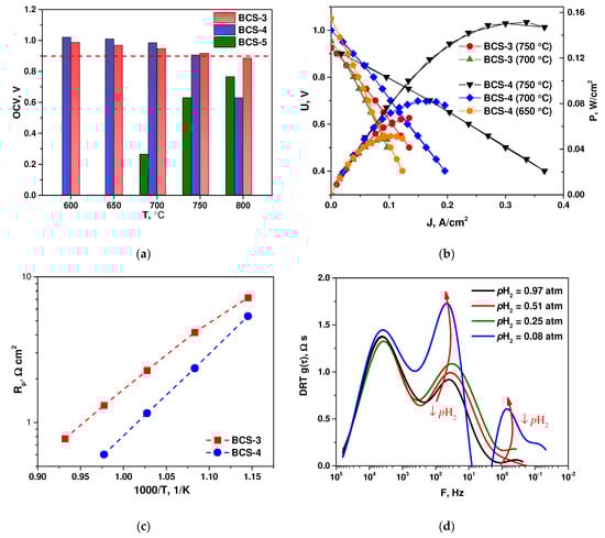 It should also be noted that the different behavior of the BCS-5 element, i.e., low OCV values, was apparently caused by insufficient film sintering due to the absence of copper in the carrying BCS-NiO substrate. For this reason, further studies were performed on the BCS-3 and BCS-4 samples. It was found that with increasing temperature, the specific power of the fuel cells increased and amounted to approximately 70 and 50 mWcm−2 at 750 and 700 °C, respectively, for BCS-3 and approximately 160, 80 and 50 mWcm−2 at 750, 700 and 650 °C, respectively, for BCS-4 (Figure 9b). Such a difference in the specific power obtained for the cells with the close total electrolyte thickness can be due to various reasons. The first possible reason is that the supporting anode of the BCS-4 sample was activated by the impregnation of finely dispersed cerium oxide to reduce its polarization resistance [54]. The effect of cerium oxide on the polarization resistance of the fuel cell is shown in Figure 9c; it can be seen that in the case of the BCS-4 sample the total polarization resistance of the electrodes is much lower due to a decrease in the contribution of the anode resistance (the cathode was the same for both cells). Variation of the partial pressure of hydrogen at the anode of the BCS-4 fuel cell with subsequent analysis of the electrochemical impedance spectra by the distribution of relaxation times (DRT) showed that the resistance of the high-frequency stage did not depend on the partial pressure of hydrogen (Figure 9d). This indicates that this step is associated with an oxygen reduction reaction at the cathode of the fuel cell. The behavior of the mid-frequency and low-frequency processes depend on the partial pressure of hydrogen, which clearly indicates that these stages belong to the hydrogen oxidation reaction at the anode of the cell. The obtained data correlate well with the results obtained in a detailed analysis of the behavior of traditional fuel cells with an oxygen-conducting electrolyte using the DRT method [55].