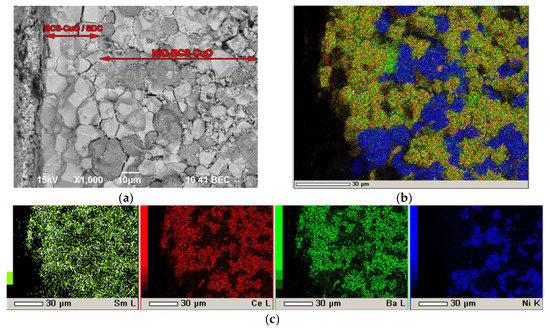Fracture images of the BCS-4 sample with the BCS-CuO/SDC electrolyte layer on the NiO-BCS-CuO anode substrate (sintered at a temperature of 1450 °C for 5 h) after electrochemical testing in the SOFC mode: (a) SEM image, magnification 1500× (b) integral map of the elements’ distribution; (c) individual elements’ maps.