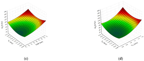 The parity plot for steady-state permeate flux is shown in Figure 1a. As it can be seen, the second-degree polynomial model shows good agreement between experimental and predicted flux values. Figure 1b,c show the effects of transmembrane pressure (X1) with feed (X2) and gas (X3) velocities on the permeate flux, respectively. It can be seen (Figure 1b), that the maximum values of permeate flux are obtained for the highest transmembrane pressure and superficial feed velocity values. The steady-state flux increases with the increase in both feed velocity as well as TMP, indicating a strong synergistic effect between these variables (Figure 1b). On the other side, the increase in gas velocity resulted in lower flux improvements compared to the feed superficial velocity rise (Figure 1c). Transmembrane pressure in both cases had a positive effect on the flux enhancement. The influence of superficial feed and gas velocities on steady-state permeate flux is depicted in Figure 1d. The increase in both superficial velocities shows the positive effects on steady-state permeates flux.