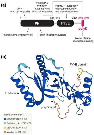 About 170 homologous Phafin2 sequences are associated with humans. Unlike PH-, FYVE-, or polyD-containing proteins, the polyD motif is encoded together with the PH and FYVE domains in Phafin1 and 2 (Supplementary Figure S6 and File S4). Phafin1 (PLEKHF1; Figure 5) shares a high sequence similarity with Phafin2, but it presents an additional tail of 27 amino acids downstream of the polyD motif [10]. Phafin1 is not only involved in autophagosome formation [10], but is also linked to apoptosis [84], caveolae-associated endocytosis, bacteria removal in macrophages, and the induction of innate immunity [85].