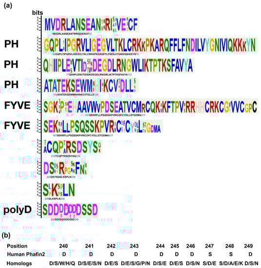 Homolog proteins are usually the preliminary platforms used for evolutionary studies and the functional annotation of proteins [25]. Phafin2 is composed of an N-terminal PH domain, a central FYVE domain, and a C-terminal polyD motif (Figure 1). To obtain structural insights, we retrieved the estimated three-dimensional structure of human Phafin2 from AlphaFold. Whereas the PH and FYVE domains are displayed as globular domains, the polyD motif-containing C-terminal region is predicted to be disordered, thus, providing conformational flexibility for protein interactions, including the intramolecular association with the PH domain (Figure 1). MEME identified ten highly conserved regions in Phafin2, including the C-terminal polyD motif. Most of the conserved amino acids are found within the PH and FYVE domains (Figure 2). The polyD motif of human Phafin2 is ten-amino acids long (240-DDDDDDDSSD-249), but variable amino acid positioning was identified in protein homologs (Figure 2). Although highly conserved, serine residues can also be present in other positions within the motif (Figure 2). Quantitative phosphoproteomic studies indicated that human Phafin2 serine residues at positions 239, 247, and 248 are phosphorylated [26], emphasizing the role of these residues within the polyD region. In addition, aspartic acid was often found to be replaced by glutamic acid within the polyD motif (Figure 2), indicating that the conserved acidic nature of the motif is relevant for the function of Phafin2.