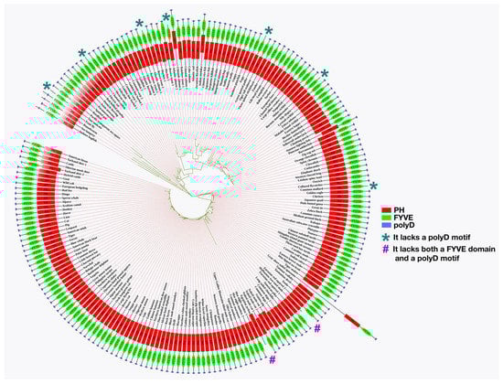 Plants possess a vast number of functional activities related to PH- and FYVE-containing proteins. Our study found ~250 sequences from database searches, but it is possible that some of these sequences correspond to contaminants from fungal species. Moreover, no polyD motif was identified in plant proteins. Instead, the PH and FYVE domains were present in the form of RhoGEF-PH-FYVE and VHS-FYVE-UIM-UIM tandem domains. In addition, RING finger and ankyrin repeats were encoded with FYVE domains (Table 1, Figure 4 and Figure S4, and Supplementary Files S3 and S4). The PH domain is the predominant lipid-binding domain of plants. About sixty PH domain-containing proteins have been detected in the Arabidopsis genome [76]. Plant PH domains preferentially exhibit an association with phosphoinositides and phosphatidic acid, leading to widely diverse functions. For example, the Medicago truncatula ZR1 protein regulates root and nodule development, which might be mediated by interactions of its PH and FYVE domains with phosphoinositides and phosphatidic acid [77]. However, the regulation of ZR1 interactions with phospholipids remains to be investigated. Other studies involve the role of the PH domains of proteins that lack FYVE domains. Arabidopsis thaliana AtPH1 is a late endosomal, vacuolar, and multivesicular body protein that regulates vacuolar metal transporter localization through the interaction of its PH domain with PtdIns3P [78]. A. thaliana SEC3 is a PH domain protein that binds membrane PtdIns(4,5)P2, which is required for pollen tube growth and provides the site of pollen germination [79]. Indeed, SEC3 function might be restricted by subcellular localization since the protein can be regulated by both PtdIns(4,5)P2-dependent and -independent mechanisms [79]. Moreover, plant enzymes bear PH domains as they occur with the phosphatidylinositol-4-kinase, which produces PtdIns4P, the most abundant phosphoinositide required for the control of cell membrane identity [80].