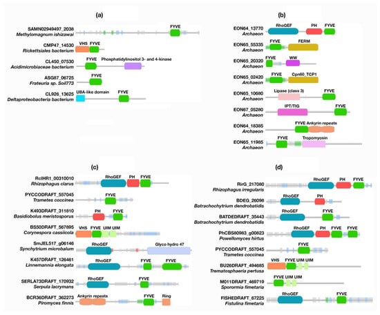 Schematic representation of PH- and FYVE-containing domains found in proteins from bacteria (a), archaea (b), fungi (c), and plants (d). Other unique domains are also shown.