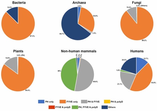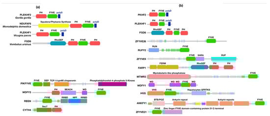 Schematic representation of PH-, FYVE-, and polyD-containing modules found in proteins from nonhuman mammals (a) and humans (b). Other unique domains are also shown.
