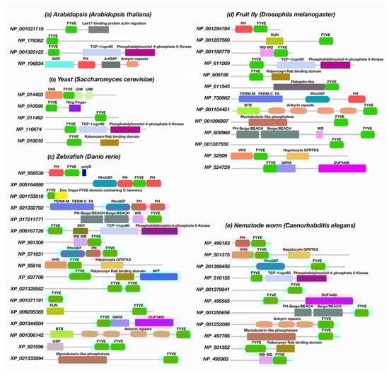Availability of PH-, FYVE-, and polyD-containing modules in model organisms. (a) Arabidopsis thaliana, (b) Saccharomyces cerevisiae, (c) Danio rerio, (d) Drosophila melanogaster, and (e) Caenorhabditis elegans.