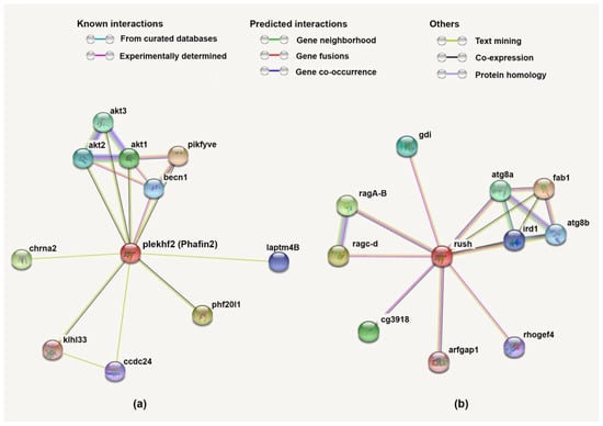 Protein–protein interaction network of human Phafin2 (a) and D. melanogaster Rush (b) generated using the STRING database. The color of the lines connecting the proteins indicates the typology of the protein–protein interaction. (a) BECN1, Beclin-1; PIKFYVE, PtdIns3P 5-kinase; PHF20L1, PHD finger protein 20-like protein 1; CHRNA2, neuronal acetylcholine receptor subunit α-2; LAPTM4B, lysosomal-associated transmembrane protein 4B; CCDC24, coiled-coil domain-containing protein 24; KLHL33, Kelch-like family member 33. (b) Atg8a, autophagy-related 8a; Atg8b, autophagy-related 8b; ird1, immune response-deficient 1; Gdi, guanine dissociation inhibitor; fab1, formation of aploid and binucleate cells 1; ArfGAP1, ADP-ribosylation factor GTPase-activating protein-1; Rho GEF4, Rho guanine exchange factor 4.