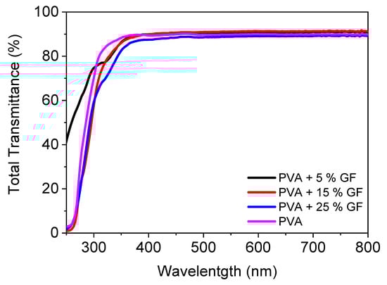 Figure 2 illustrates the UV-VIS spectra of a PVA filled with glass flakes. In the visible zone, pristine PVA had a transparency of 89%. With the addition of glass flakes, there was a modest increase in transmittance, which was attributable to a decrease in the reflectance of the pure PVA [32]. The addition of the glass flakes did not decrease the transparency since the refractive index of the PVA and the refractive index of the glass flakes matched perfectly with each other, i.e., 1.48 for PVA and 1.54 for the glass flakes [33,34,35,36]. Furthermore, when the filler quantity was increased, the transmittance of the layers decreased linearly [37]. The layers containing 5% and 15% fillers had transmittances of 90%. With 25% filler added to the PVA, the transmittance was reduced to 87%. This loss of transmittance can be attributable either to the light’s scattering caused by micronized glass flakes inside the film, or to any internal defect. The latter appears to be the most apparent possibility, given the transmittance fell linearly as the filler material increased [34,38]. These obtained results clearly demonstrate that the films were perfectly transparent and can be utilized as transparent food packaging for the encapsulation of dried fruits and bakery items.