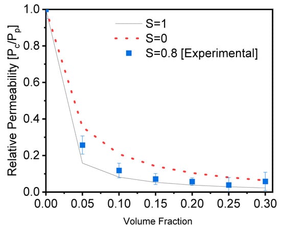 Equations (2) and (3) are used to compute the theoretical and experimental relative permeability of the films, and the results are shown in Figure 3.