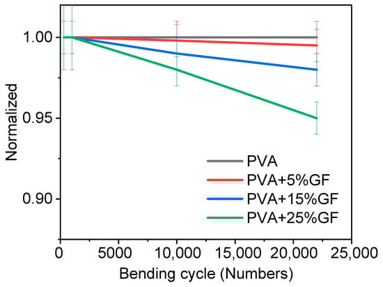 Barrier materials must also be flexible without being harmed in order to encapsulate various foods. Thus, glass-flakes-based films should not be fragile and rigid. Hence, a bending test was performed to optimize the number of glass flakes and their impact on flexibility. The bending test was performed on films containing different amounts of glass flakes. The bending results are shown in Figure 4. The bending test was performed with a bending radius of 6 cm. Figure 4 clearly shows that increasing the amount of the glass flakes decreased the flexibility, as the initial WVTR of the bent films deteriorated. Figure 4 depicts a comparison of the bending performance of the films [34]. The pristine PVA films retained their initial WVTR values after 20 K bending cycles. Even after 10 K bending cycles, the water-barrier characteristics of the PVA films with glass flakes were reduced by 5 to 25% of their initial value. This was because the PVA at a film thickness of 100 µm remained flexible and showed no adverse effects of bending in terms of WVTR. The films having 5 wt% glass flakes exhibited a slight decrease (around 2%) in the films. Similarly, the films having 15 wt% and 25 wt% of glass flakes also showed a decreasing trend in bendability. A decrease of around 3% and 5% was observed in the films having 15 wt% and 25 wt% of glass flakes, respectively [42]. The decrease in WVTR was not that significant, which meant that the glass flakes and PVA had a firm adhesion to each other. Due to the firm adhesion between the glass flakes and the PVA, when the films were bent, the glass flakes were disoriented but returned to their original orientation when the forces were removed. A small decrease in WVTR may be due to the generation of nanosized defects, while the bending allowed moisture to decrease and caused overall permeability in the film [42].