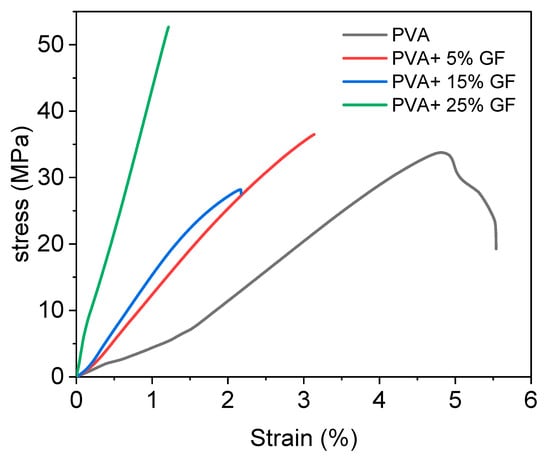 Stress–strain diagram of PVA film with different concentration of glass flakes (GF). The black line indicates the simple PVA film, the red line indicates the 5% GF with PVA, the blue line indicates the PVA with 15% GF, and the green line indicates 25% GF.