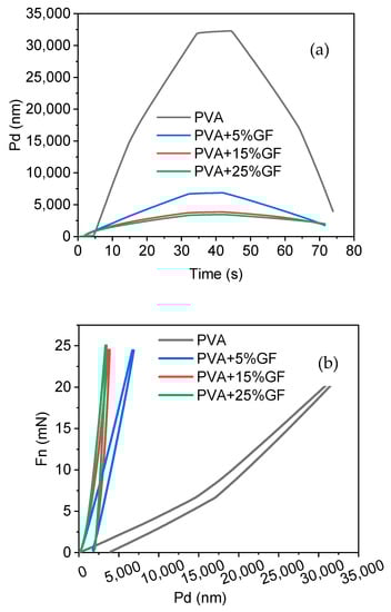 Nanohardness results. (a) Penetration depth vs. time curves of the PVA and PVA thin films with glass flakes (GF). (b) Force vs. penetration depth: PVA film indicated by the black line, PVA with 5% GF film indicated by the blue line, PVA with 15% GF film indicated by the red line, and PVA with 25% GF film indicated by the green line.