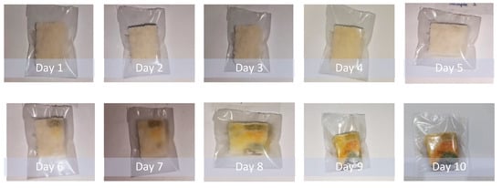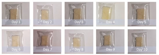 The biodegradation study was carried out on bread pieces packaged in low-density polyethylene (LDPE) bags and prepared PVA films with 15% glass flakes. Bread pieces were encapsulated in glass-flakes-based PVA films and commercial LDPE films. The encapsulation process was carried out in an inert atmosphere using a glove box. The encapsulated samples were placed in ambient conditions in the room for 10 days. The degradation data are shown in Figure 7 and Figure 8. Figure 7 shows the degraded polyethylene bag packaged bread piece sample. We observed that the bread piece started to degrade by means of fungal growth at some point after day 3. With the passage of time, the fungus grew all over the piece, and the quality of the piece was deteriorated due to low oxygen and the high carbon dioxide partial-pressure effects on a wide range of fungal species. This fungus growth mechanism is supported by the work done by Legan J.D. (2021) [48]. On the other hand, the degradation of the bread piece encapsulated in the PVA with glass flakes is shown in Figure 8. It was evident from the data that the bread piece maintained its quality and freshness even after day 10. No fungus growth was observed in the sample during the course of the testing period. Furthermore, the freshness of the bread piece also remained intact. These obtained results clearly indicate the PVA and glass-flakes-based coatings are ideally suited for the packaging of food items. The films remained flexible and kept the freshness of the food for a sufficiently long period, increasing the shelf life of the packaged food [49].