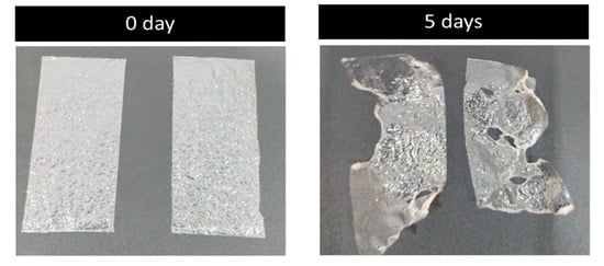 A five-day soil burial degradation test was also performed to examine the biodegradability of the developed films. In this test, the films were buried in the soil for about five days, and photographs were recorded. The results are presented in Figure 9. It is evident from the photos that about 40–60% of the weight of the original films was lost, which is an obvious indicator of the biodegradation process carried out by the combined effect of micro-organisms and the moisture present in the soil. The film made of PVA and glass flakes blended well with the soil and began to deteriorate. By day 5, around 40% of the PVA film with glass flakes had degraded, whereas the PVA film had almost broken into pieces, with around 60% of that sample already degraded. Comparing the PVA/glass-flakes-based bioplastics to synthetic plastic, this study found that PVA-based films deteriorated faster in moisturized soil.