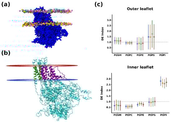 Analysis. Trajectories were PcATP2-centered using the GROMACS built-in gmx trjconv tool []. The trajectories of the four replicates of each system were concatenated using gmx trjcat for the analysis when it was required []. Lipid density maps were generated using gmx densmap []. The relative depletion/enrichment (DE) of lipids around PcATP2 was calculated using in-house Python scripts with the MDAnalysis Python package [,] applying a contact cut-off distance of 0.55 nm between any bead of PcATP2 and any bead of each lipid species using a similar approach to a previously reported method []. The choice of a cut-off distance is dependent on the minimum distance between two beads, which in the case of the Martini 2.2 force field is ~0.50 nm for standard beads (excluding the small beads used for ring structures) []. Therefore, the definition of a contact between two beads must be made considering a distance higher but close to 0.5 nm. In our case, the choice of a 0.55 nm cut-off follows this criterion and has also been widely used for the contact analysis between Martini CG beads, including many lipid–protein interaction studies [,,,,]. In order to calculate the DE indices, the fraction of each lipid species around 0.55 nm PcATP was calculated for each frame of the trajectory. The ratio between this fraction and the fraction of the corresponding lipid species in the leaflet composition was calculated to obtain the DE index for each species in each frame