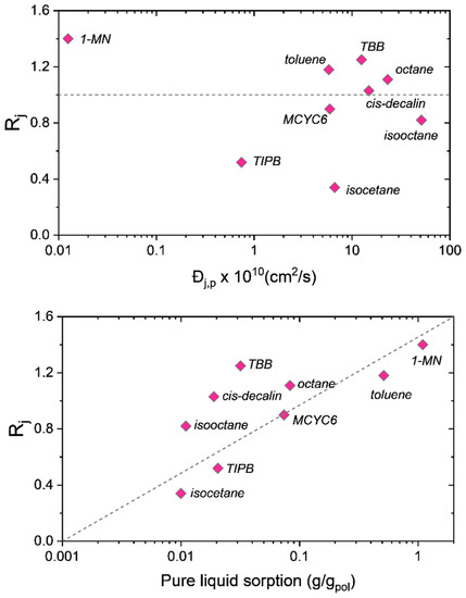 Figure 3 plots the separation coefficients of the nine-component mixture versus the pure liquid diffusivities in the membrane, while the bottom panel plots the separation coefficients versus the pure liquid solubility (sorption) in the membrane. The top panel of