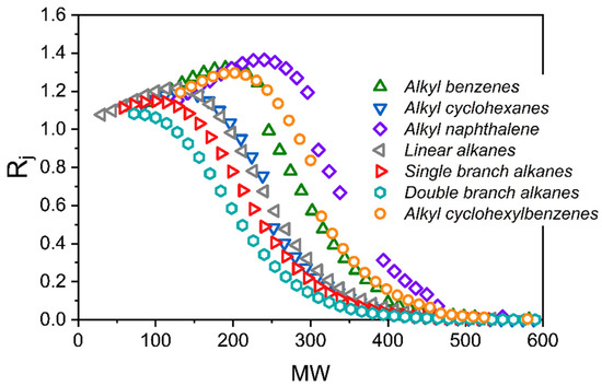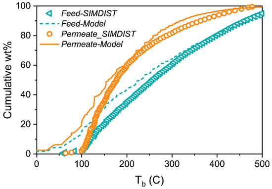 12], the separation of the nine-component liquid mixture can be accurately predicted using only pure component vapor sorption isotherms at room temperature to parameterize the model. Furthermore, this same approach was applied to predict the SBAD-1 membrane-based separation of a light shale crude, and it accurately predicted the distillation curve of the permeate using a petroleum fraction representation based on the boiling point. While being useful for predicting the distillation properties, this approach did not allow for the prediction of the partitioning of molecular classes. In this work we represent the light shale crude using a detailed compositional model based on structure-oriented lumping [