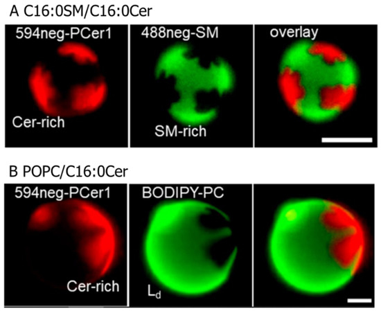 Fluorescence micrographs of binary-component giant unilamellar vesicles (GUVs) that underwent phase separation between the ceramide-rich and ceramide-poor (thus, phospholipid-rich) domains. (A) C16:0SM/C16:0Cer (95:5, molar ratio) GUVs containing 0.2 mol % 594neg-PCer1 (ceramide-rich domain marker) and 0.2 mol % 488neg-SM (SM-rich domain marker). (B) Palmitoyl-oleoyl–phosphatidycholine (POPC)/C16:0Cer (95:5, mole ratio) GUVs containing 0.2 mol % 594neg-PCer1 and BODIPY-PC (POPC-rich fluid phase marker). Bars indicate 10 μm. Image brightness and contrast were adjusted for clarity. This figure was adapted with permission from [41]. Copyright 2019 American Chemical Society.