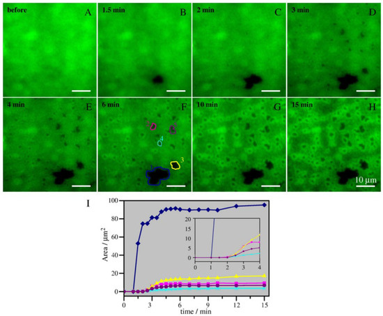 Real-time sphingomyelinase (SMase)-induced coalescence of raft-like ordered domains visualised using total internal reflection fluorescence (TIRF) microscopy. Egg-SM/Chol/dioleoylphosphatidylcholine (DOPC) (5:1:5 in molar ratio) bilayers, which contained 0.5% fluorescently labelled dipalmitoylphosphatidylethanolamine (a non-raft domain marker), were imaged before (A) and at various times after (B–H) injection of 1 U/mL SMase. The dark regions correspond to raft-like domains. (I) Areas of “domains” 1–5 (outlined in panel F) were plotted as a function of time after enzyme injection; the inset shows initial slopes of the curves. The graphs show expansion of the dark patches during the first 0–15 min. This figure was redrawn from [58] with permission from Elsevier (License No. 5334110330270).