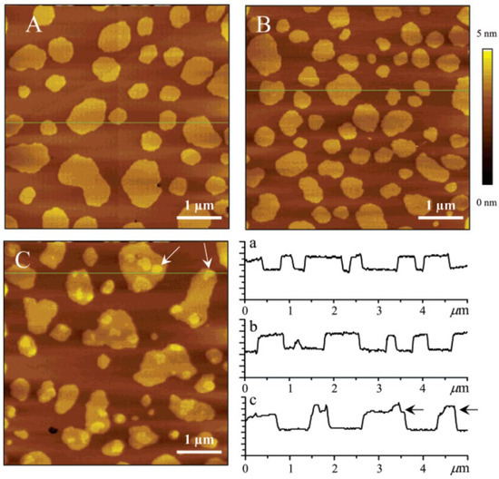AFM images of C16:0SM/Chol/DOPC (2:1:2 molar ratio) bilayers containing 0 (A), 5 (B), and 10 (C) mol % of C16:0Cer. The total mole percentage of SM plus ceramide was kept constant at 40%. All images are 5 × 5 µm with a z-scale of 5 nm. Cross-sections for lines indicated in images (A–C) are shown in a, b, and c, respectively. The Lo domains showed higher membrane thickness while the Ld domains showed lower. Thus, the brighter and darker regions correspond to the Lo and Ld domains, respectively, in these AFM images. Some examples of the convex subdomains for 10% ceramide are indicated by arrows in image C and cross-section c. This figure was adapted with permission from [61]. Copyright 2006 American Chemical Society.