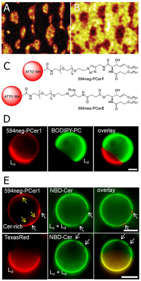 (A,B) Time-of-flight secondary ion mass spectrometry (ToF-SIMS) images for C16:0SM/Chol/DOPC/C16:0Cer-d31 (3:2:4:1 molar ratio) monolayers deposited on the substrate at 30 mN/m. (A) shows distribution of m/z 2 signals due to deuterium in the negative ion mode that is used to monitor the location of deuterated ceramide. (B) shows distribution of m/z 281 signals due to the oleate fragment that was used to monitor DOPC. (C) illustrates chemical structures of newly developed fluorescent ceramide analogues 594neg-PCer1 and 594neg-PCer2 (inclusively termed 594neg-PCer). (D) Fluorescence micrographs of C16:0SM/Chol/DOPC (1:1:1 molar ratio) ternary component GUVs that underwent phase separation between the Lo and Ld domains. This sample contained 0.2 mol % 594neg-PCer1 and BODIPY-PC (Ld marker). (E) Fluorescence micrographs of C16:0SM/Chol/DOPC/C16:0Cer (1:1:1:0.3 mole ratio) quaternary component GUVs. This sample contained (top) 0.2 mol % 594neg-PCer1 and 0.2 mol % NBD-Cer (both Lo and Ld marker) and (bottom) 0.2 mol % Texas Red-DPPE (Ld marker) and 0.2 mol % NBD-Cer. White and yellow arrows indicate the ceramide-rich subdomains and Lo domains, respectively. Bars indicate 10 μm. This figure was adapted with permission from [41,65]. Copyright 2008 and 2019 American Chemical Society.