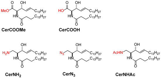While ceramide is central to signal transduction regulation, the biological functions of natural ceramides are poorly accessible because ceramide is readily transformed into more complex sphingolipids, such as SM and glycosphingolipids, via the modification of its 1-OH group [64,92]. To avoid this biosynthetic conversion, our group developed oxidised and nitrogen analogues of ceramides, in which the primary alcohol moiety was derivatised to -COOH, -COOMe, -NH2, -NHAc, and -N3 groups (Figure 6) [102,103]. In addition, we observed their capability of the domain formation in SM and POPC bilayers. Fortunately, these ceramide analogues retain their domain formability, at least to some extent. It is surprising that the -N3 analogue can form ceramide-rich domains, although it loses its hydrogen bond functionality. Thus, these ceramide analogues represent convenient tools for understanding ceramide-relevant biological functions because they are devoid of biosynthetic conversion. In particular, the -N3 analogue can be used for Raman imaging of ceramides because the -N3 group possesses striking Raman activity. Moreover, the -N3 and -NH2 groups are applicable for the in situ conjugation of fluorescent and other tags via Huisgen cycloaddition and condensation reactions, respectively. Hence, these ceramide analogues are promising molecular probes for understanding the mechanistic links between ceramide generation and biological function.