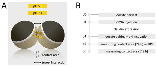 Then, the paired oocyte assay was carried out with oocyte pairs of combinations of CLDN4 + CLDN4, CLDN4 + ctrl, CLDN18 + CLDN18, CLDN18 + ctrl, CLDN4/18 + CLDN4/18, CLDN4/18 + ctrl, and ctrl + ctrl. Oocytes were placed together in 24-well microliter plates by pushing them three times together using a metal probe. Analogous to that an incubation in pH 5.5 and 7.4 ORi was carried out (Figure 1). After 24 h and 48 h and storing the oocytes at 16 °C, the contact diameter via bright-field microscopy (DMI6000 B Microscope, LAS AF software Leica Microsystems, Wetzlar, Germany) was quantified. The sizes of circular contact areas (μm2) were calculated using the formula A = π∙r2. After 48 h, the condition and the cohesion of the oocyte pairs were evaluated and examined by gently pushing them apart from each other under the binocular.
