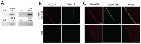 Gastrointestinal barrier integrity represents a basic physiological requirement for individual body function. Paired oocyte assays have been carried out from the time at which connexin was identified and functionally analyzed [20]. The prerequisite for the currently applied paired oocyte assay was the expression of CLDN4, CLDN4/18, and CLDN18 after three days of injection of the cRNA. The results demonstrated a successful heterologous expression at the correct size. In addition, claudins were localized in the oocyte membrane using immunohistochemistry. The immunoblots and confocal immunofluorescent stainings confirm the Xenopus oocyte as an appropriate heterologous expression system also for the gastric TJ proteins claudin-4 and claudin-18, after other human TJ proteins claudin-1, -2, -3, and -5 have already been successfully heterologously expressed and characterized in oocytes by our group [4,9] and other expression models, namely epithelial cells [21,22], respectively.