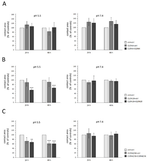 The paired oocyte assay revealed significantly smaller contact areas for CLDN18-expressing and CLDN4/18-co-expressing oocyte pairs in acidic pH, whereas in neutral pH, apart from CLDN18 + CLDN18 pairs, which showed a slightly reduced contact area, no effects were observed. The challenge of the contact area of these combinations by hydrostatic pressure in pH 5.5 revealed stronger adhesion in accordance with trans-interactive properties. In summary, the claudin-18 contact area was not increased in the paired oocyte assay after 24 h and 48 h but showed a stronger interaction in the hydrostatic pressure experiment at acidic pH when solely expressed or co-expressed with claudin-4. This may be due to its function of protecting cells and tissues from gastric acid. These results underline the function of claudin-18 in protecting vulnerable epithelium by blocking the paracellular permeability of cations, especially H+ [16,17,24], via the formation of stronger cell–cell contacts in the acidic environment.