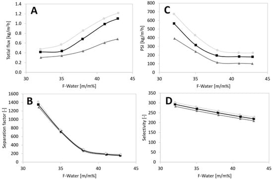 ), (A) Total flux, (B) Separation factor, (C) PSI, (D) Selectivity.