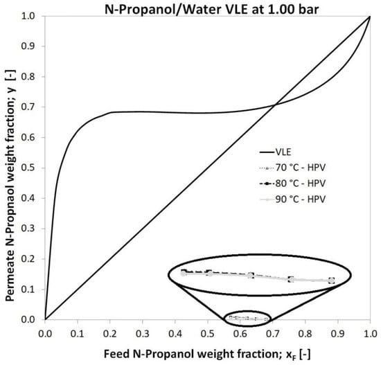 | Permeate n-propanol and water weight fraction in vapour-liquid equilibrium (VLE) diagram (Figure 5) | ||