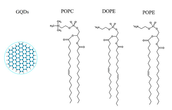 The cytotoxicity of GQDs is lower than that of GO, so GQDs are suitable for biomedical applications [17]. Relevant studies showed that 3-nanometer GQDs had good membrane permeability, while 12-nanometer GQDs had weak permeability [18]. In addition, small-sized GQDs can be used for drug delivery because they can easily enter the intracellular space to attack tumor cells, eventually leading to tumor cell apoptosis [19]. Stable sulfur-doped GQDs can be used as efficient cell-imaging materials and can penetrate the cell membrane of HeLa cells [20]. As a crucial part of the cell, the cell membrane is not only a protective barrier to the cell but also plays an important role regarding compound exchange and metabolism. Some studies reported that GQDs have potential applications in medicine and can enter cells through direct infiltration, but the variation between organisms in terms of cell membrane structure should be considered [21,22]. The main lipid component of most bacteria is 1-palmitoyl-2-oleoyl phosphatidylethanolamine (POPE). For example, Escherichia coli (E. coli) contains 70–80% POPE, 20–25% POPG, and <5% cardiolipin [18,23]. In animal cells, the 1-palmitoyl-2-oleoyl-sn-glycero-3-phosphocholine (POPC) phospholipid is the main component of the cell membrane, and the POPE content in blood cells is 6% [24,25]. Similarly, the neutral 1,2-dioleoyl-sn-glycero-3-phosphoethanolamine (DOPE) cell membrane plays a significant role in gene transmission in biological cells [26]. However, the mechanisms underlying the interactions between GQDs and different cell membranes remain unclear. Therefore, understanding the permeation process of GQDs through different cell membranes is important for the advancement of GQD drug-loading therapy and biosensor research.