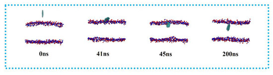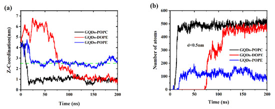 The simulation results are shown in Figure 5. Similar to DOPE and POPC, the GQDs reached the surface of the membrane at 40 ns and had completely entered the membrane at 50 ns. Similarly, the fully stabilized GQDs remained in the upper center of the membrane.