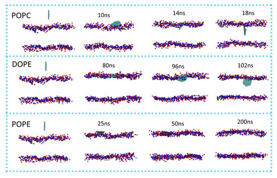 Permeation of GQDs through different cell membranes. P atoms in the cell membrane are shown as blue spheres, and N atoms are shown as red spheres. All instantaneous screenshots were produced using VMD software.