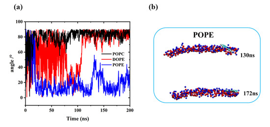 (a) Change in the plane angle between GQDs and the cell membrane during simulation. (b) Angle of GQDs on POPE cell membrane at 130 and 172 ns.