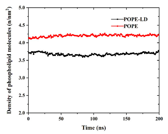 To explore whether the change in phospholipid molecular density in the membrane would affect the penetration of GQDs, we constructed a low-density POPE membrane (POPE-LD). Without changing the number of phospholipid molecules (i.e., 342), the density of phospholipid molecules in the system can be changed by expanding the size of the outer frame of the cell membrane. The size of the simulated box was expanded from 9.0 × 9.0 × 10 nm3 to 9.6 × 9.6 × 10 nm3, and the position of GQDs was kept unchanged. By adding water molecules, the cell membrane was completely balanced for 10 ns under NVT conditions. During the balancing process, the energy and temperature of the system tend to be stable (see Supplementary Materials for details). This shows that after 10 ns NVT simulation, the cell membrane tended to equilibrium.