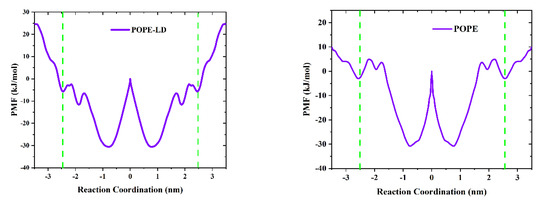 To further explain the translocation mechanism of the GQDs on the cell membrane, PMF was used to calculate the shift in free energy of GQDs on POPE membranes, as shown in Figure 7. In the systems, the center of the cell membrane was defined as the zero point of free energy, and the surface free energy of GQDs from the liquid phase to the cell membrane decreased. It shows that GQDs are more inclined to adsorb on the surface of cell membranes than liquid phase water. However, compared with the POPE-LD membrane at low density, GQDs need to cross the higher energy barrier on the surface to enter the POPE membrane, which reduces the probability of GQDs penetrating the membrane surface of high-density phospholipid molecules. In addition, it is noted that the lowest points of free energy are located above the inner center of the cell membrane. In the PMF curve of POPC and DOPE cell membranes at low density (see Supplementary Materials for Figure S2), the free energy change of GQDs entering the cell membrane decreases, and the surface energy barrier is low. The lowest point of free energy is located inside the cell membrane, which is consistent with our MD results.