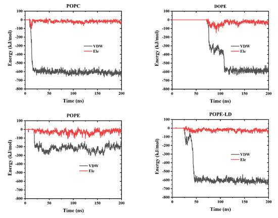 GQDs can penetrate cell membranes, and interactions between them include electrostatic (Ele) and Van der Waals (VDW) forces. To explore the interactions between the GQDs and the cell membranes in all systems in the MD simulation, as shown in Figure 8, the changes in these two forces with time were calculated. Among them, VDW and Ele forces were zero, indicating that the GQDs were not yet in contact with the cell membrane. When touching the surface of the membrane, the GQDs were pulled into the membrane by the effects of VDW and Ele forces. From the overall calculation results, it can be observed that the effect of VDW force was significantly stronger than that of Ele force, which is the main driving force for GQDs to enter the cell membrane. However, in the high-density POPE system, the effects of VDW and Ele forces were weaker than those of the other systems, which is not sufficient to drive GQDs into the cell membrane.